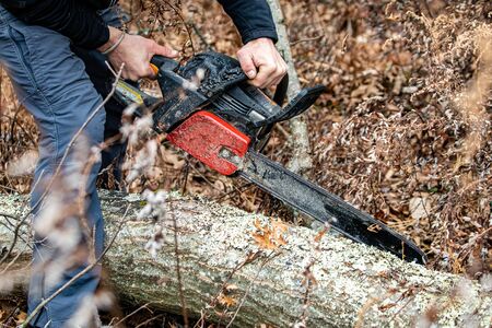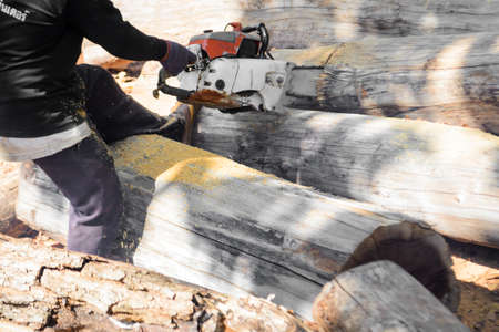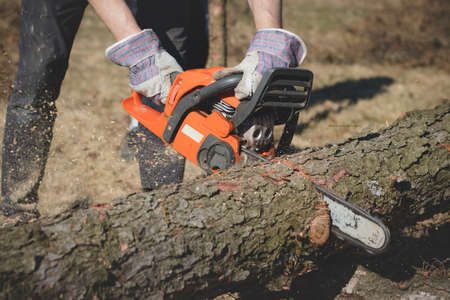 Lumberman using chainsaw sawing dry wood lying on ground.