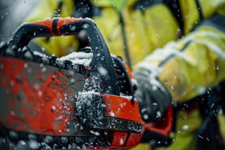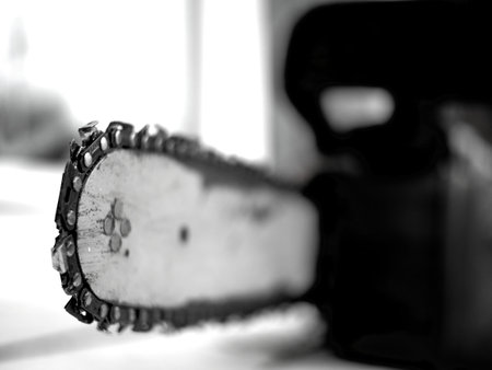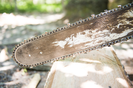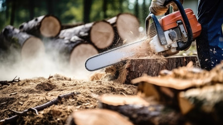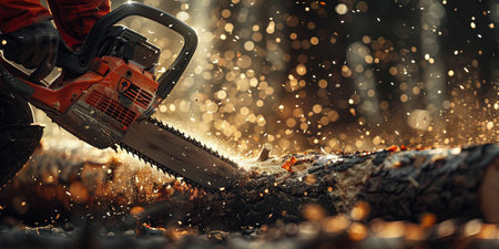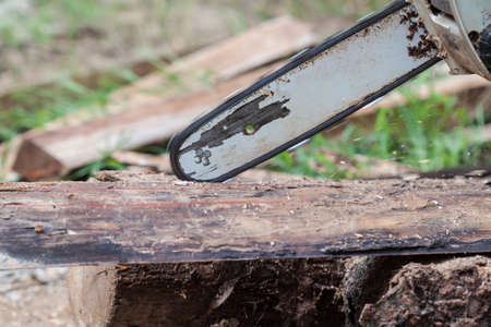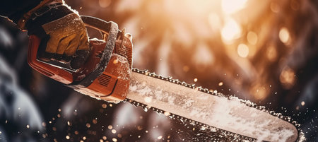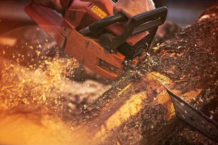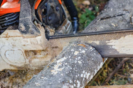 Chainsaw. Close-up of woodcutter sawing chain saw in motion, sawdust fly to sides. Concept is to bring down trees.