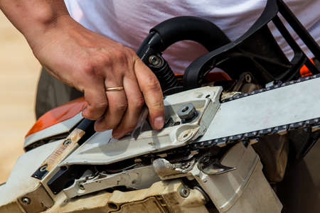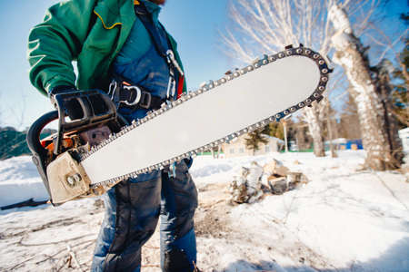 Chainsaw. Close-up of man lumberjack holding chainsaw for cutting down trees.