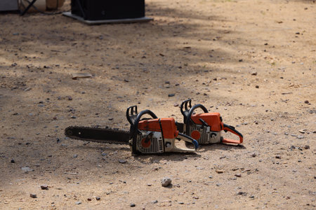 Chainsaws Are Resting on the Dirt Ground in a Picturesque Outdoor Setting Surrounded by Nature