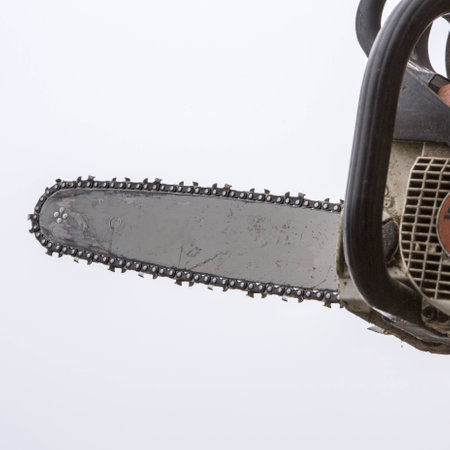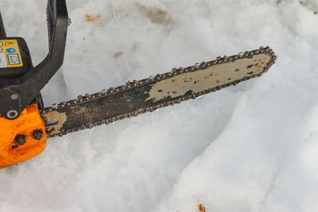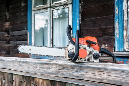 close-up view of chainsaw, construction tools, agriculture details. Gardening equipment