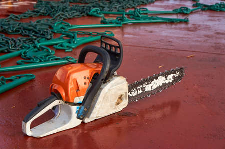 Chain saw laying on deck of ship and used for lashing of cargo. Cargo lashing and securing concept.