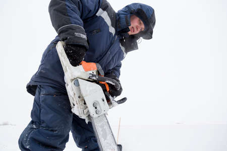 Construction worker using portable gasoline chainsaw for tree cutting in close up view