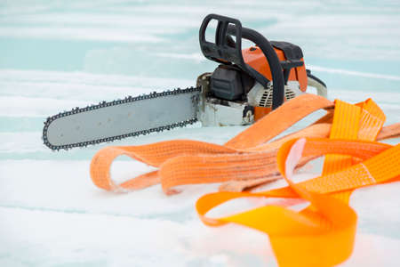 Orange ribbon sling and gasoline saw on the background of transparent ice slabs