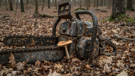 Rusty chainsaw on forest floor with mushroom growing through chain