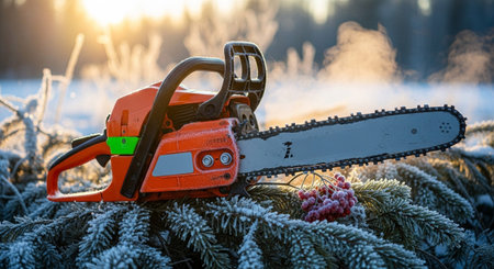 An orange chainsaw rests on frosted pine branches with red berries, illuminated by the sunrise.