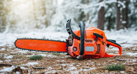 An orange chainsaw rests on a forest floor covered in a light dusting of snow. Pine needles and small branches are scattered across the ground, with the textured bark of trees visible in the blurred background. Sunlight filters through the trees, casting a warm glow on the scene. The chainsaw's sharp chain and rugged are prominent.