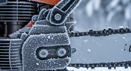 A detailed close-up shot focuses on the chain and bar of a chainsaw, heavily coated in frost and ice crystals. The metallic surfaces are rendered in shades of gray and white, emphasizing the cold and harsh winter conditions. The intricate texture of the frozen dew and ice highlights the rugged nature of the tool, suggesting its use in challenging, cold environments. The conveys a sense of power and resilience against the