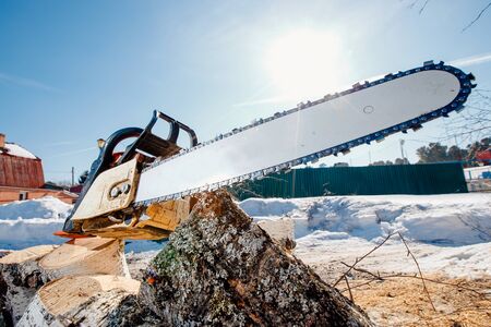 A lumberjack chainsaw. Harvesting of firewood. cutting down trees.