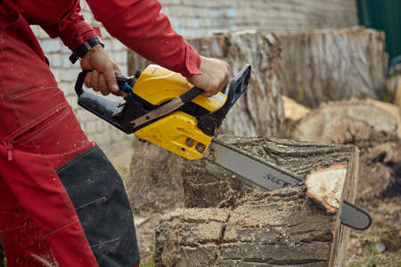 foreman in work clothes cuts a dry tree with a chainsaw for later processing. Woodcutting in the forest. Close-up of chainsaw at work. Sawdust flies out from the chain.