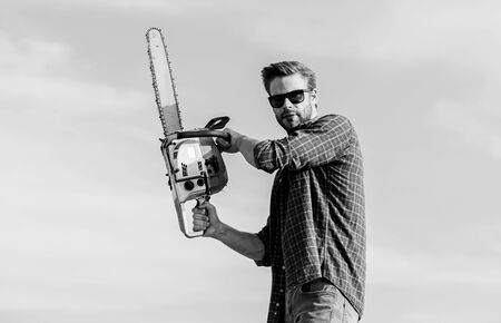 Sharp blade. Handsome man with chainsaw blue sky background. Gardener lumberjack equipment. Lumberjack with chainsaw in his hands. Dangerous job. Feeling confident. Risky temper. Powerful chainsaw
