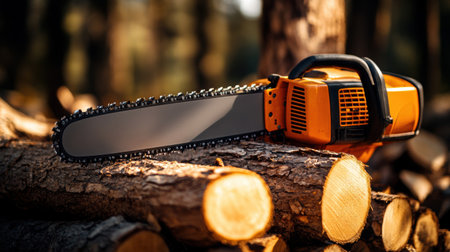 chainsaw resting next to fallen tree in a forest, created with generative ai