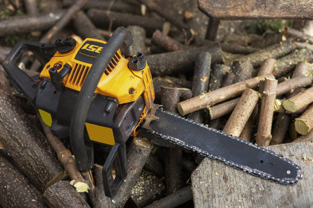 chainsaw on pile of cut wood and timber, lumberjack and sawdust