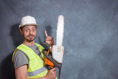 A funny man holds a chainsaw in his hands and raised his finger up. Worker, European, 40 years old, wearing a helmet and a vest.