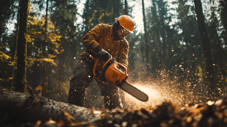 A skilled logger operates a chainsaw to slice through a large downed tree in a vibrant forest, surrounded by sunlight filtering through the trees.