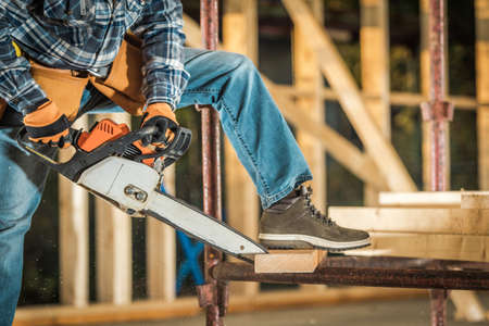 Construction Contractor Cutting Wood Board Using Powerful Chainsaw Power Tool. Wooden Skeleton Structure of Residential Building. Construction Industry Theme.