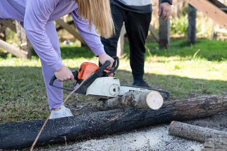 A vertical shot of a blondwoman cutting wood with a chainsaw