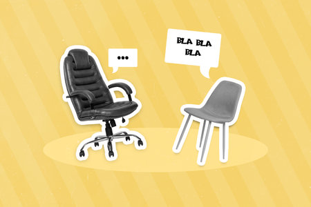 Creative photo collage promotion of two interior decoration chair talking conversation alive furniture chatterbox sale isolated on beige background