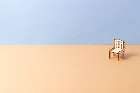 A toy miniature wooden chair stands on a beige-blue background. Furniture for dolls and dollhouse.
