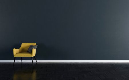 Interior design scene with a modern yellow chair on blue wall, copy space in the wall
