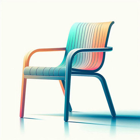Shallow depth of field image of variously arranged steel and colorfully stained leather chairs on a colorless wood tile pattern floor. This image is a 3d render.