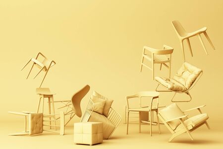 Yellow pastel chairs in empty Yellow background. Concept of minimalism and installation art. 3d rendering mock up