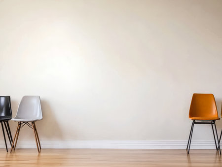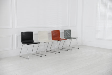 Four chairs of different colors sit against a light-colored wall in a minimalistic space. The wooden floor enhances the modern feel of the environment creating a calm atmosphere.