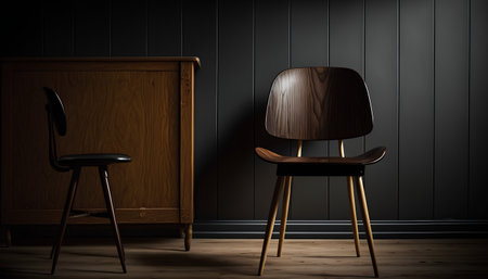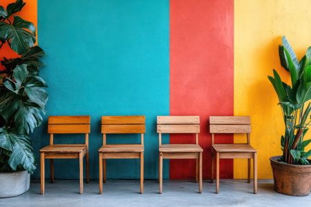 Two simple wooden chairs stand side-by-side in front of a bold, vibrant wall, highlighting minimalism, interior design, and spatial balance.