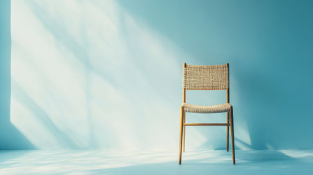 A minimalist wooden chair sits in a bright room, illuminated by soft natural light that casts gentle shadows on the blue wall, evoking a serene and stylish atmosphere.
