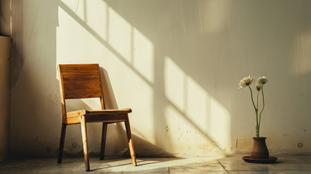 An empty room features a single chair and a decorative object illuminated by warm sunlight streaming through a window. The composition emphasizes the contrast between light and shadow. The image uses a minimalist style and is suitable for various design, advertising, and conceptual projects.