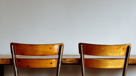 Two wooden chairs are positioned against a neutral backdrop, showcasing their natural wood grain and simple design. The composition features a horizontal arrangement, with focused lighting that accentuates the textures. This image could be used for web design, advertising, or as a background in publications.