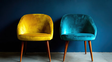 Two contemporary chairs are featured in a studio setting, showcasing a vibrant yellow and a teal blue color scheme. The chairs have rounded backs and wooden legs, set against a solid, dark blue backdrop. The lighting is diffused, highlighting the soft texture of the upholstery. This image is suitable for use in design, home decor, or advertising projects.