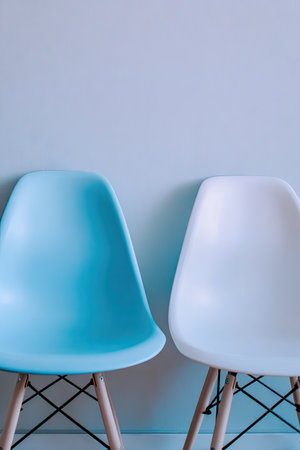 Two contemporary chairs are featured in a vertical composition against a muted wall. One chair is a soft blue, while the other is white. The scene is brightly lit, creating smooth highlights. This image can be used for commercial projects such as website design, interior design, or product promotion.