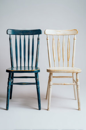 Two vintage wooden chairs are displayed against a white backdrop. One is painted a deep blue, the other a cream color, showing the design and texture. The lighting appears soft, suggesting an indoor setting. This image may be suitable for interior design, home decor, or stock photography uses.