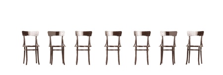 Studio shot of many wooden old styled chairs isolated on white background