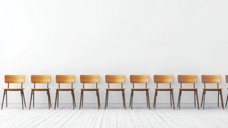 A serene arrangement of wooden chairs lined up against a white wall, showcasing a minimalist design that enhances any interior space with elegance and simplicity.