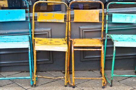 Colorful rusty metal chairs outside a store