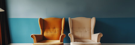 Indoor setting features two armchairs in vibrant yellow and light blue colors. Classic design with white cushions and wooden legs. Gray wall backdrop with natural light from window