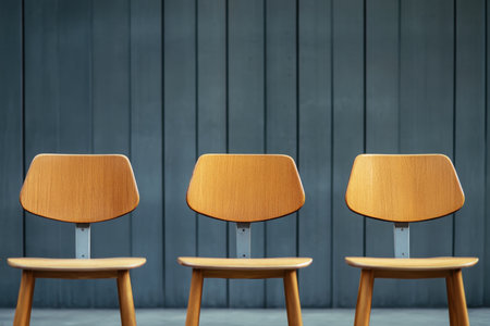 Three wooden chairs are lined up neatly against a gray wooden wall, creating a modern, minimalist look.