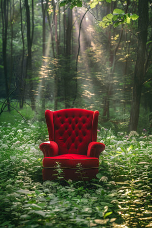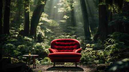 Unusual Red Armchair Placed in a Lush Forest Setting