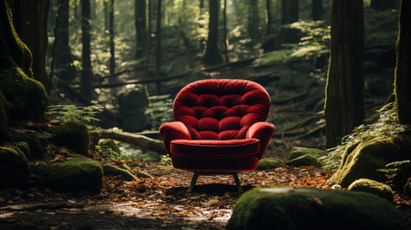 Red chair in the forest. Generative AI