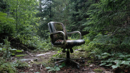 An abandoned office chair is overgrown with moss and plants in a lush green forest. Sunlight filters through the trees, highlighting the forgotten furniture among nature.