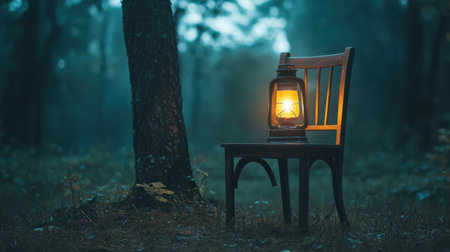 A vintage lantern rests on a wooden chair in a foggy forest, creating a tranquil and mysterious ambiance. This captivating scene evokes nostalgia and adventure.