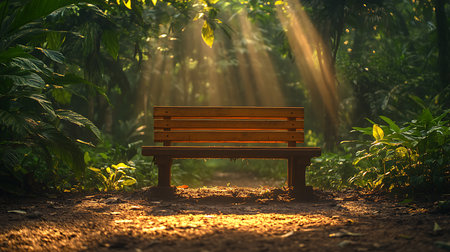 A beautifully handcrafted wooden chair is elegantly positioned in the tranquil and serene setting of a peaceful forest. Generative AI