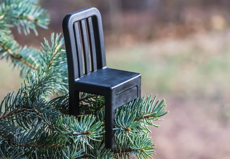 A beautiful small toy black plastic chair is on a fir-tree on a blurred background in the park for Christmas or New Year decoration