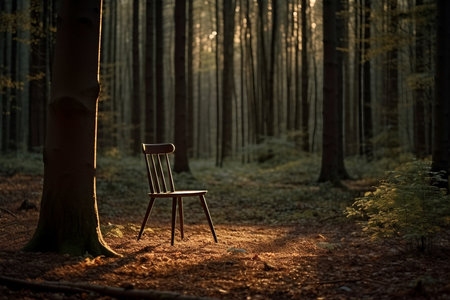 a small wooden chair in the woods, captured in a hyper-detailed 8k rendering. this realistic depiction showcases the chair's materials and the natural lighting of the outdoor scene. with a focus on everyday life, this 32k uhd image immerses viewers in the serene beauty of nature. ai generated