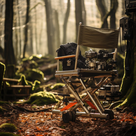 Vintage film camera in the forest. Filmmaking concept.