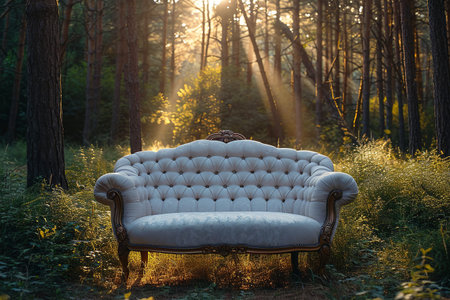 An elegant sofa sits alone in a serene forest, bathed in soft sunlight. This tranquil scene invites relaxation and contemplation amidst natures beauty.