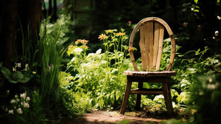 Wooden chair amidst blooming flowers in a summer garden created for relaxation and decoration