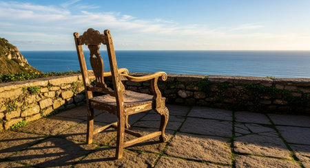 Nature's Oasis: A Rustic Armchair Set Against Majestic Mountain Scenery